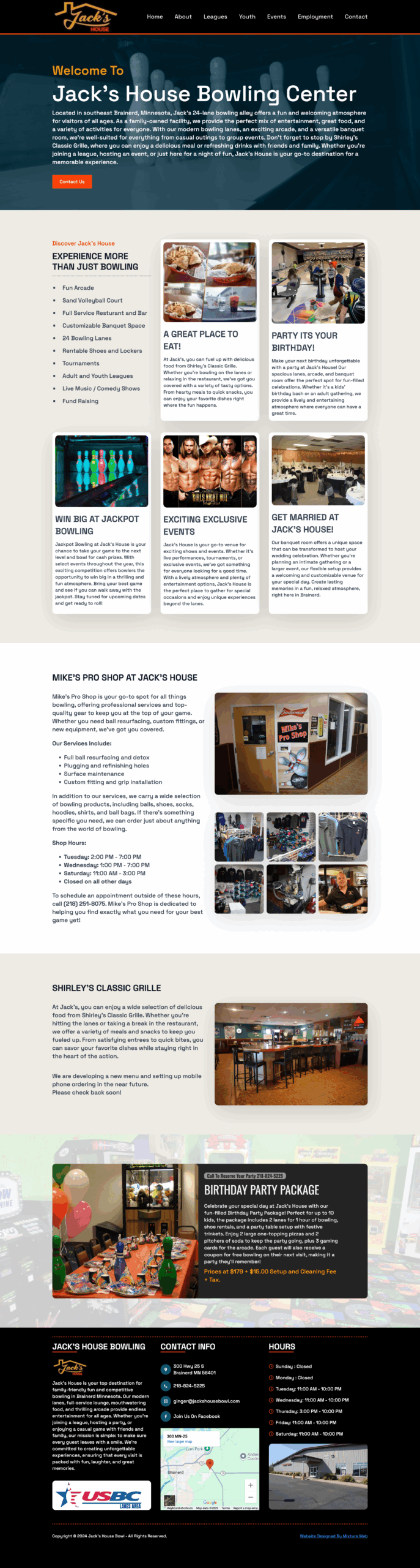Screenshot of Jacks House Bowling Center website featuring information about leagues family fun parties pro shop dining location business hours photos of bowling and food plus a Client Corner for contact details and customer inquiries