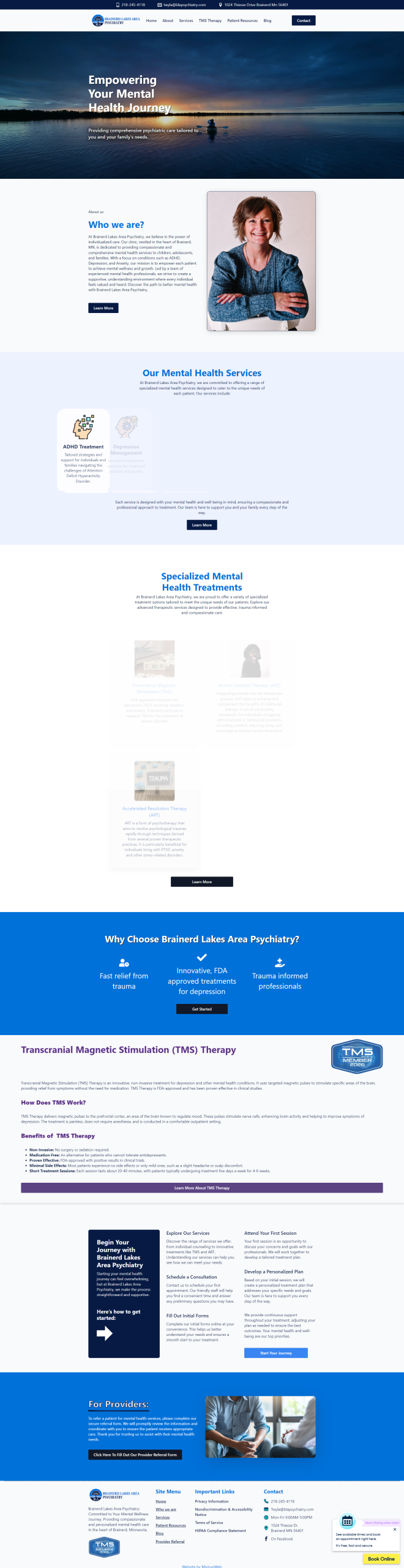 Screenshot of the Brainerd Lakes Area Psychiatry website homepage featuring mental health service descriptions a photo of a woman service icons TMS therapy details testimonials contact information and the dedicated Client Corner section