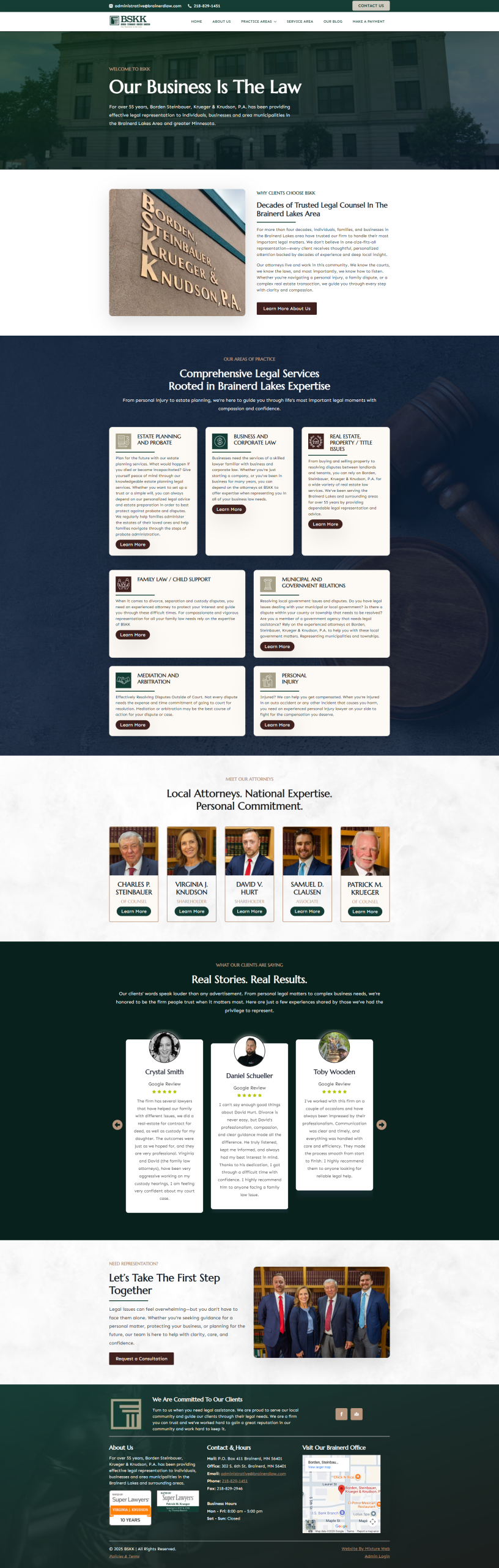 Screenshot of a law firm website featuring legal services attorney profiles client testimonials a dedicated Client Corner contact information and a main navigation menu includes images of the firm attorneys and a courthouse