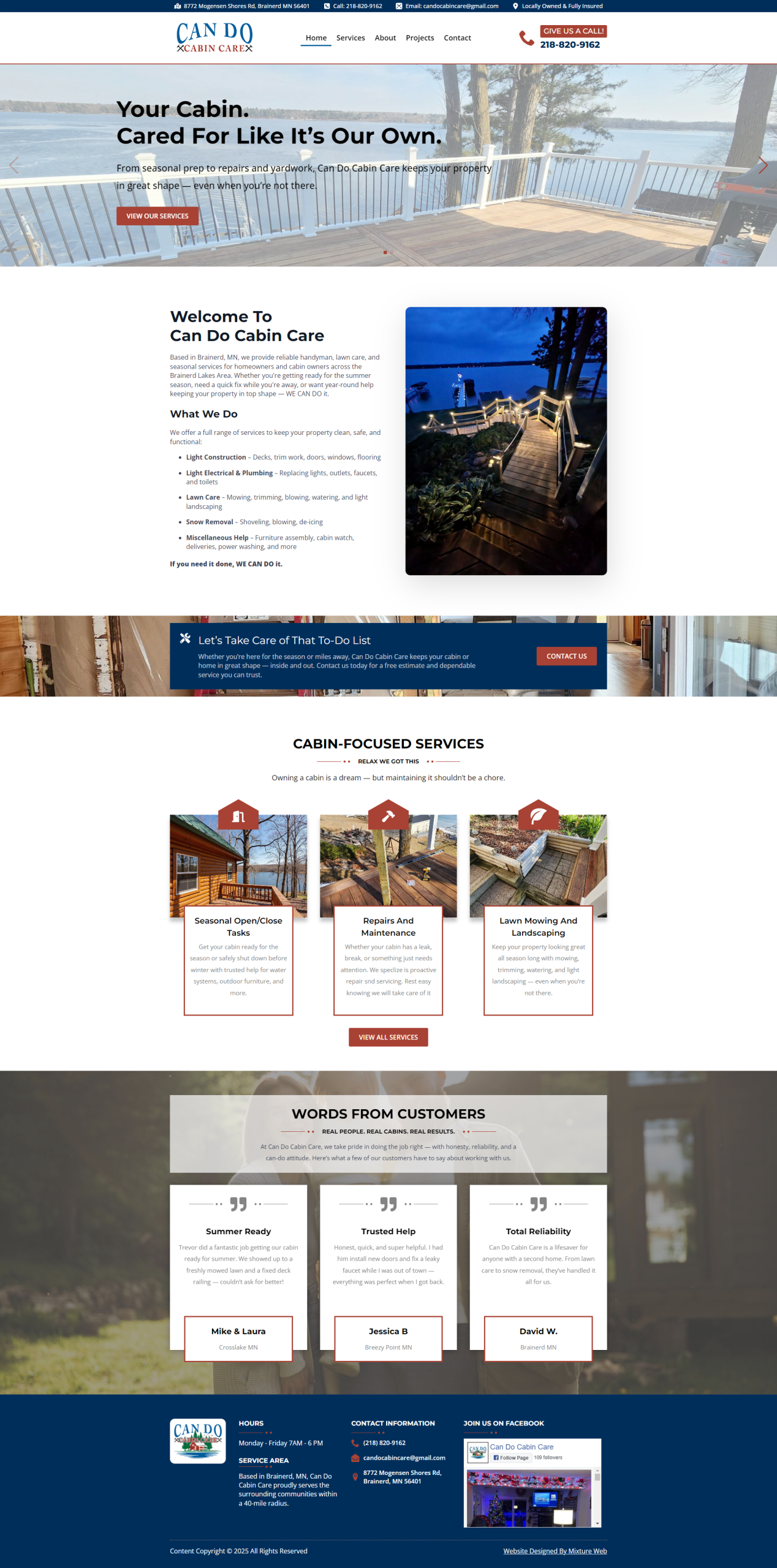 Screenshot of Can Do Cabin Cares homepage featuring a lake view service list customer testimonials Client Corner highlights and sections for cabin care repairs and learning with navigation links at the top and a contact form