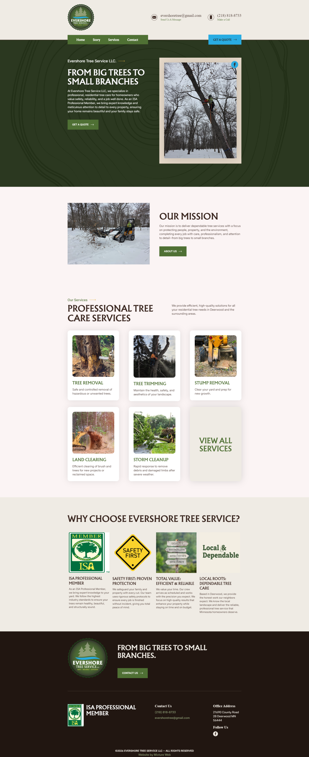 Screenshot of a tree service company website featuring a green and white design tree images service descriptions a mission statement customer testimonials a Client Corner section and contact information in the header and footer